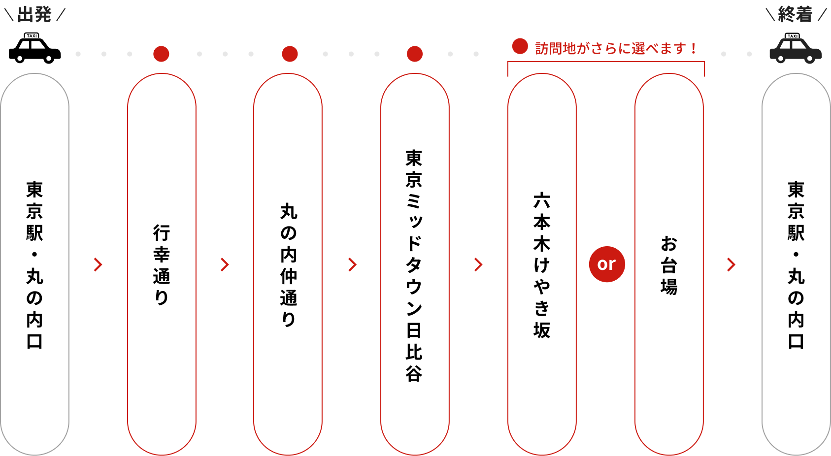 - (トライアルコース限定)基本コースは固定となります。延長、立寄先の追加、発着地の変更をご希望の場合には、オーダーメイドコースをご案内させていただく場合がございます。